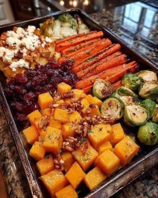 Caramelized Butternut Squash, Carrots, Brussels Sprouts & Sweet Potato with Feta, Walnuts & Cranberry-Honey Glaze