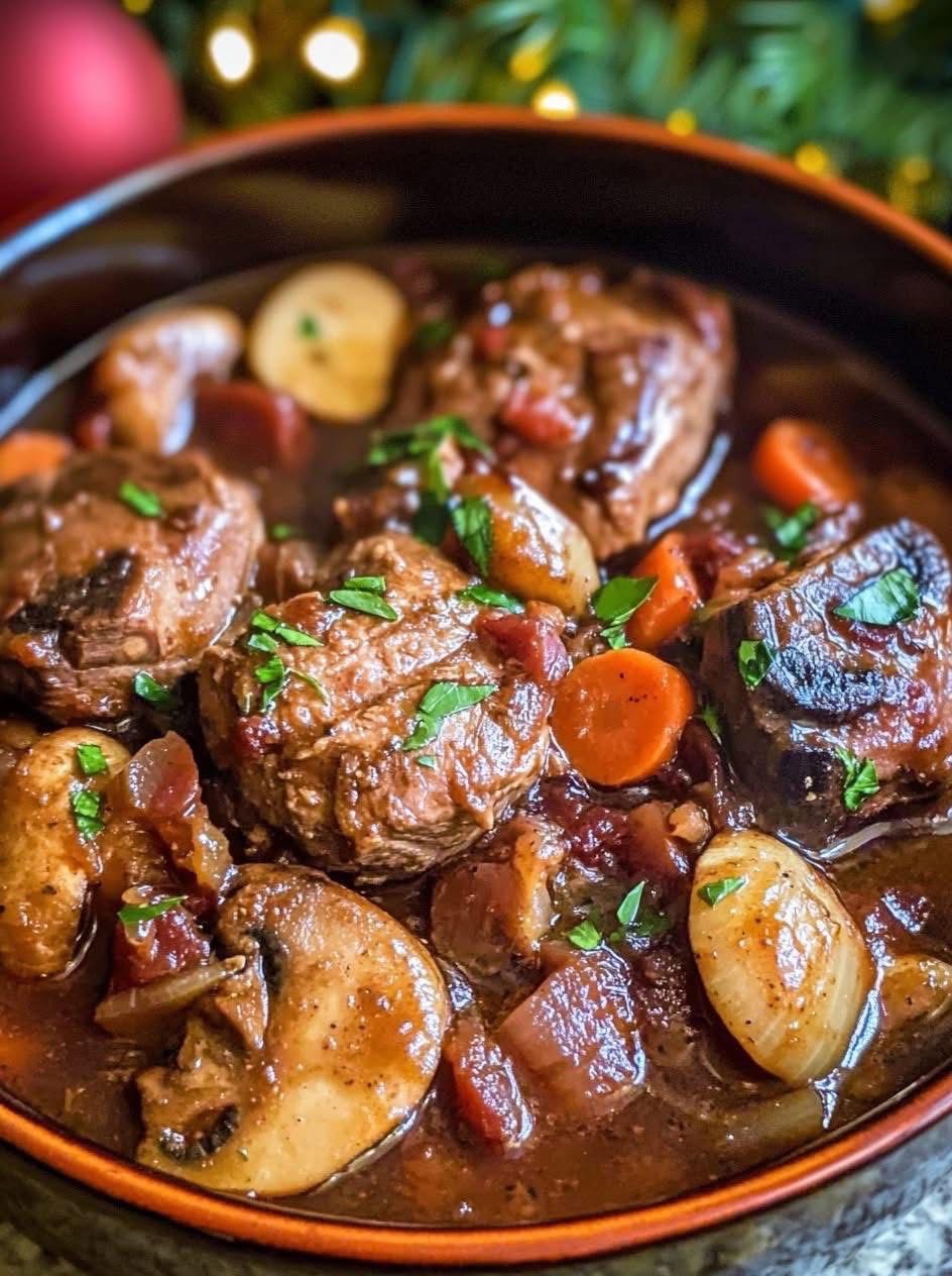 A deep, savory, melt-in-your-mouth lamb stew simmered in red wine, smoky bacon, and herbs — a rustic French classic adapted for the slow cooker.