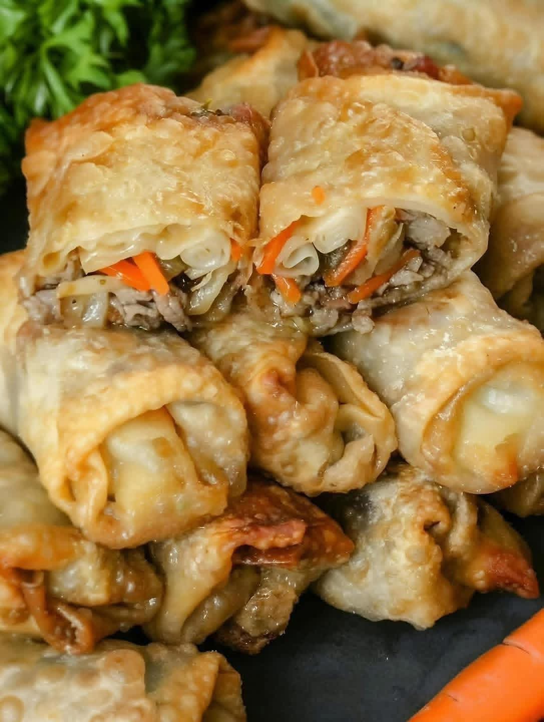 Fry egg rolls in batches for 3–4 minutes, turning, until crispy and golden brown.