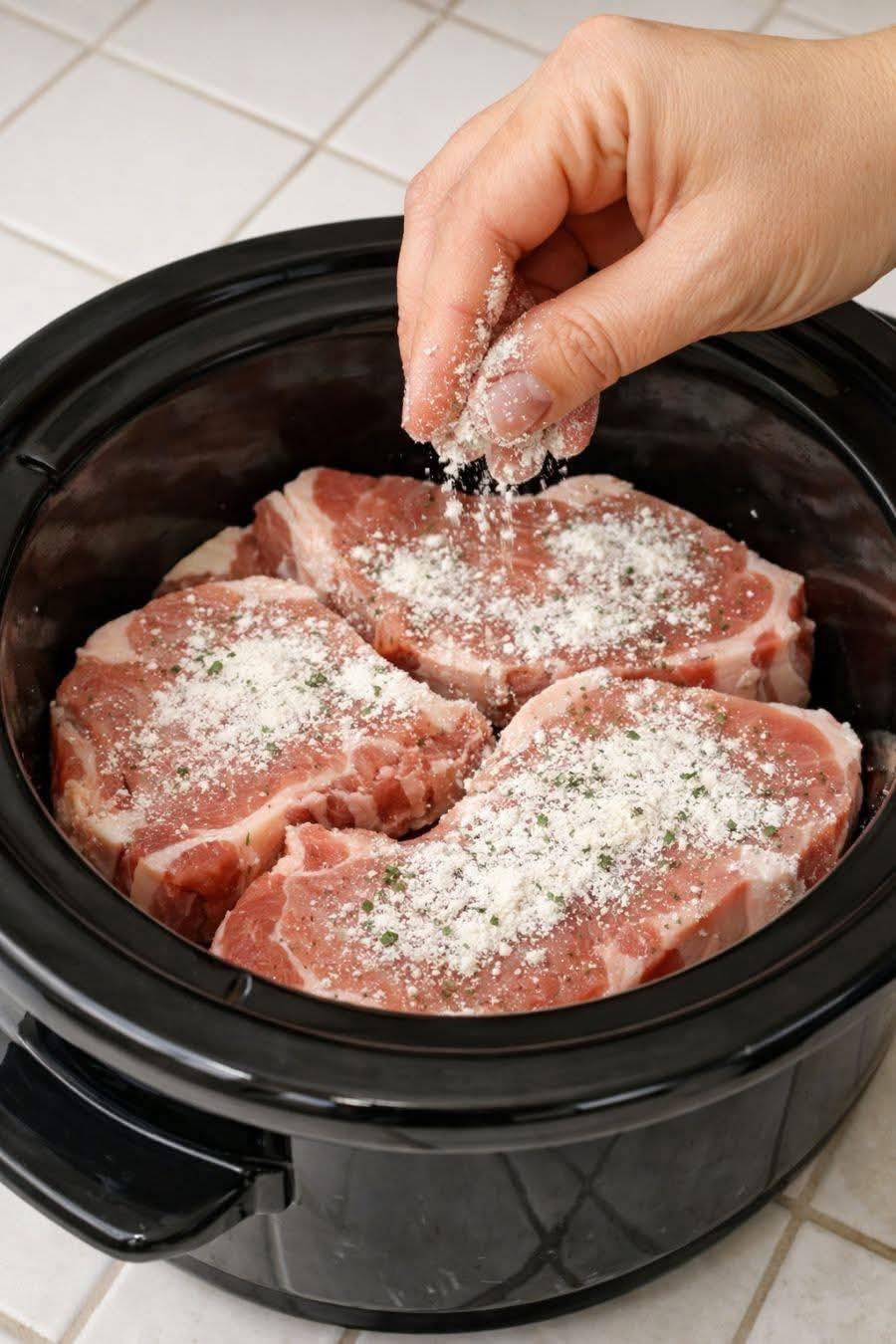 Pat pork chops dry. Sprinkle ranch seasoning on both sides (press it in a bit).
