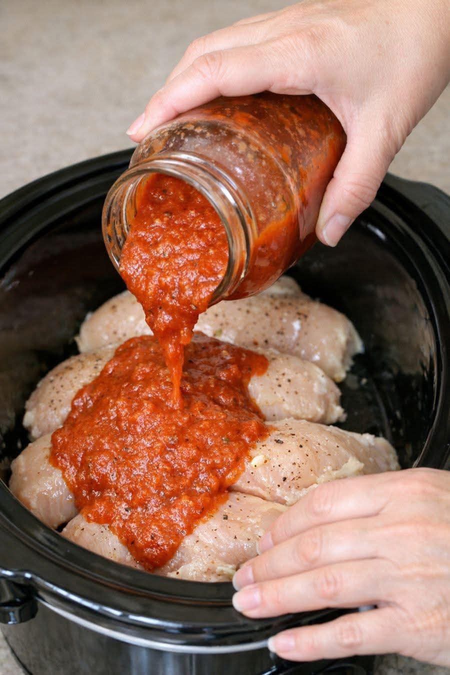 Pour salsa or marinara evenly over the chicken (just like in the photo).