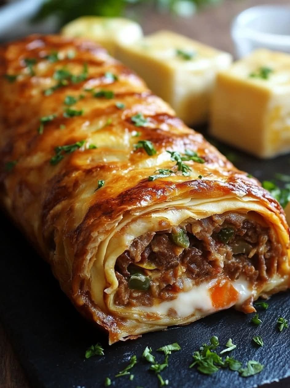 🥐 Beef & Cheese Puff Pastry Roll (Serves 4–6)