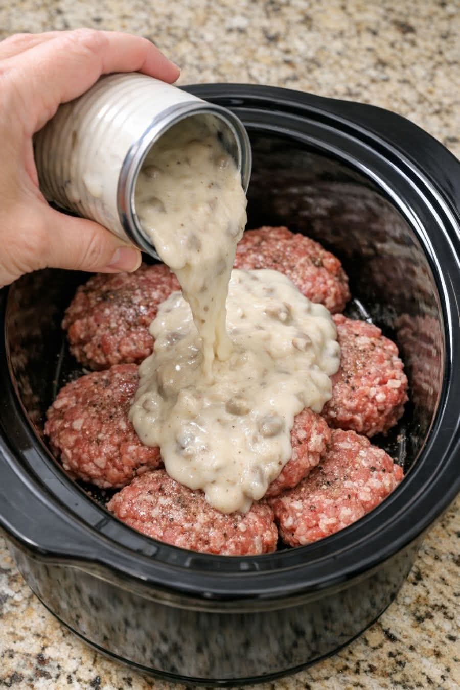 Mix soup + liquid (optional) and pour over patties. Add onions/mushrooms if using.
