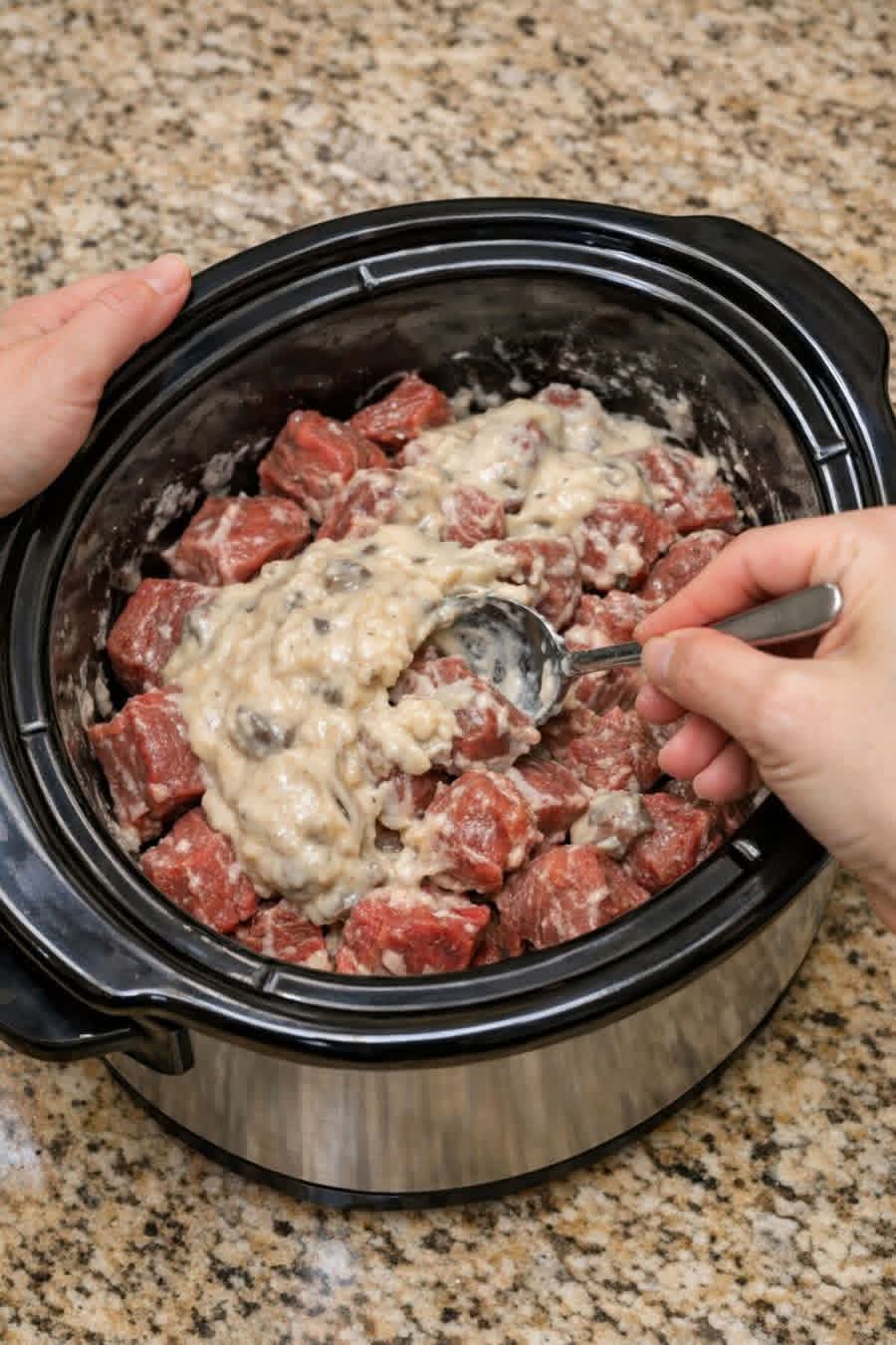 Cover and cook on LOW for 6–8 hours or HIGH for 3–4 hours, until the beef is tender.