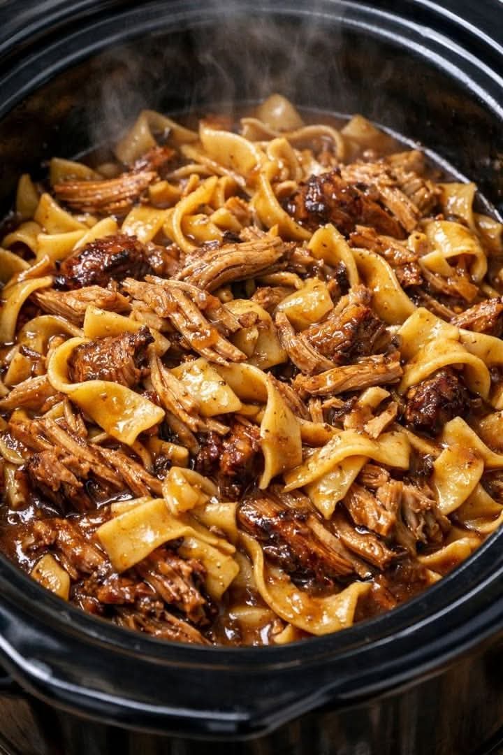 Add the cooked noodles to the slow cooker and mix with the shredded beef and sauce.