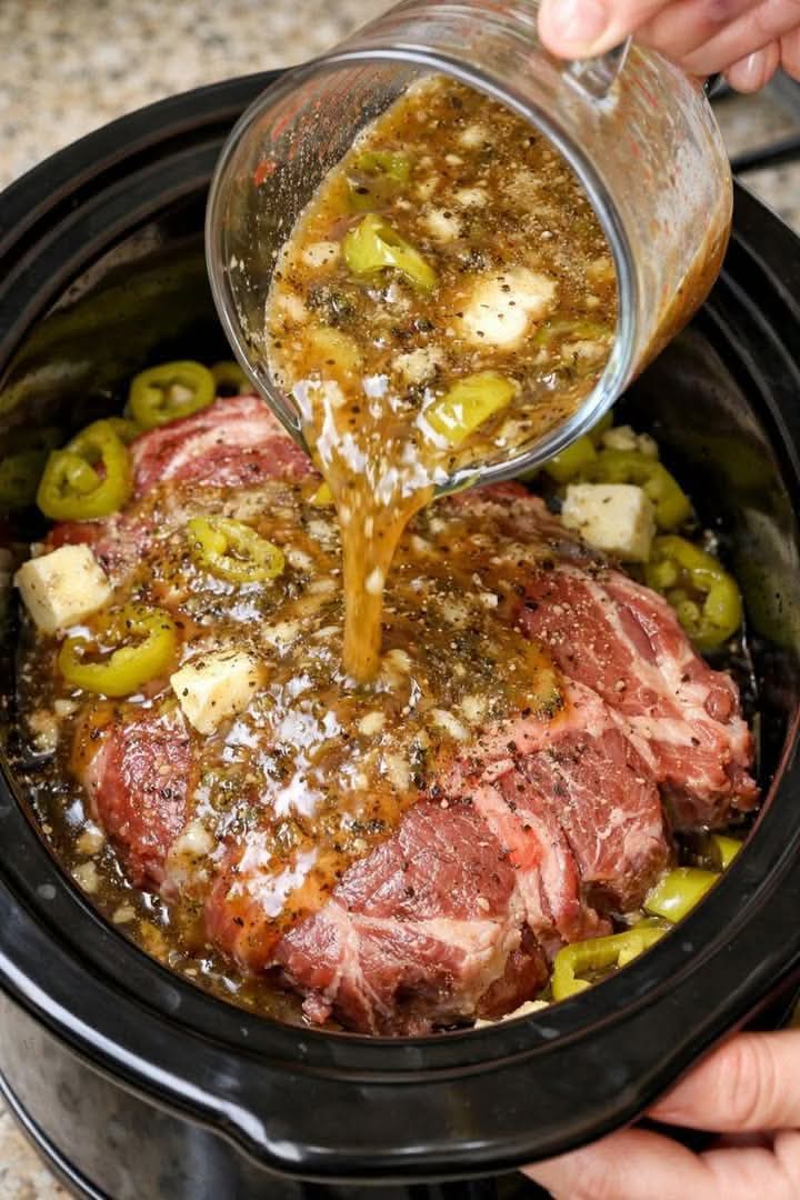 Place the butter on top of the roast, then add the pepperoncini peppers and pour in the juice.