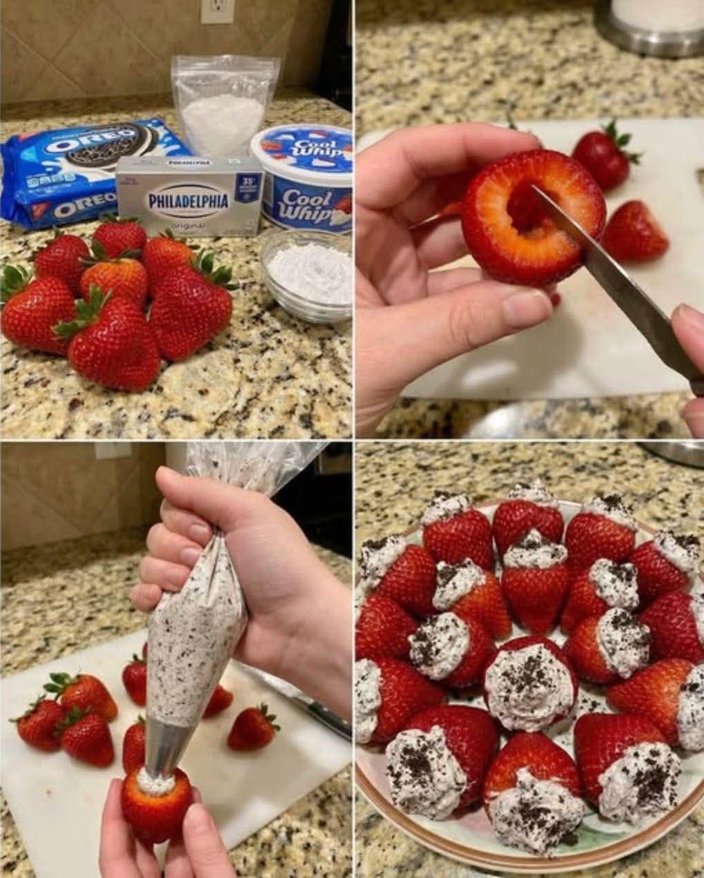 Spoon or pipe the Oreo fluff mixture into each hollowed strawberry. - Chill & serve