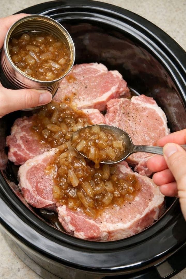 Pour the canned French onion soup evenly over the chops.