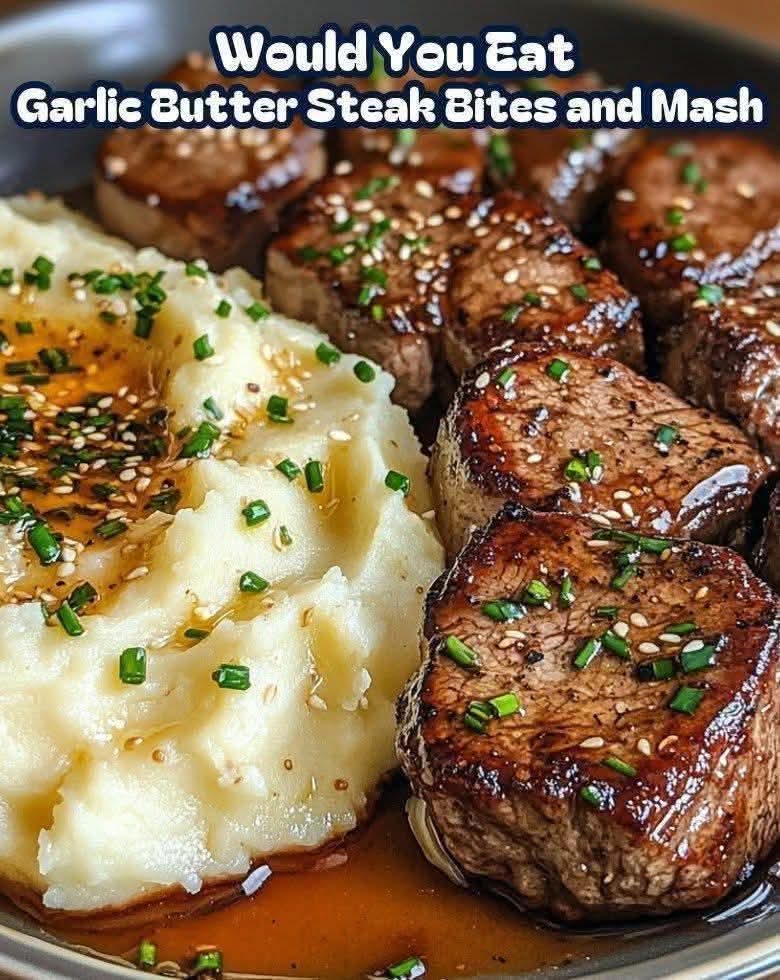 Plate the mashed potatoes, top with juicy steak bites, and drizzle extra garlic butter from the pan over everything 😍