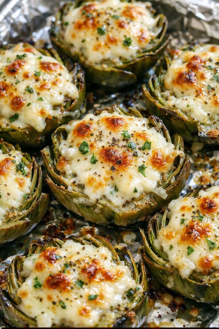 In a bowl, combine chopped artichokes, mozzarella, Parmesan, cream cheese, egg, garlic, salt, and pepper.