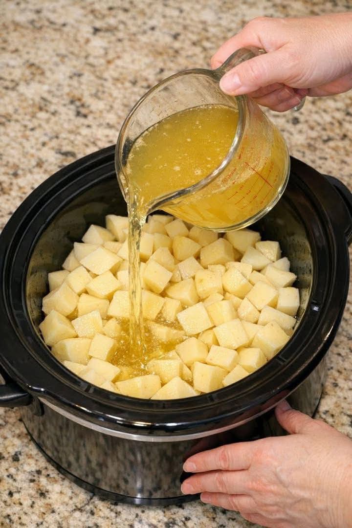 Add the cubed potatoes to your slow cooker. Pour the chicken broth over them.