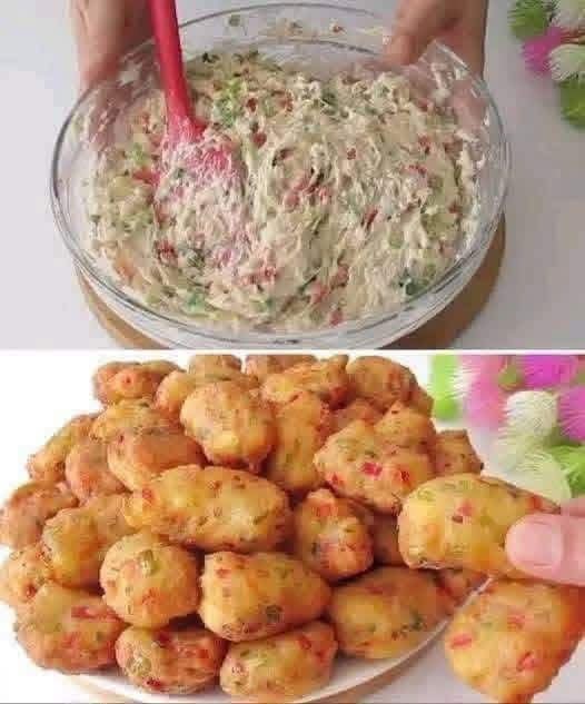 In a large bowl, combine chicken (or potatoes), cheese, eggs, flour, veggies, garlic, and spices. Mix until thick and sticky.