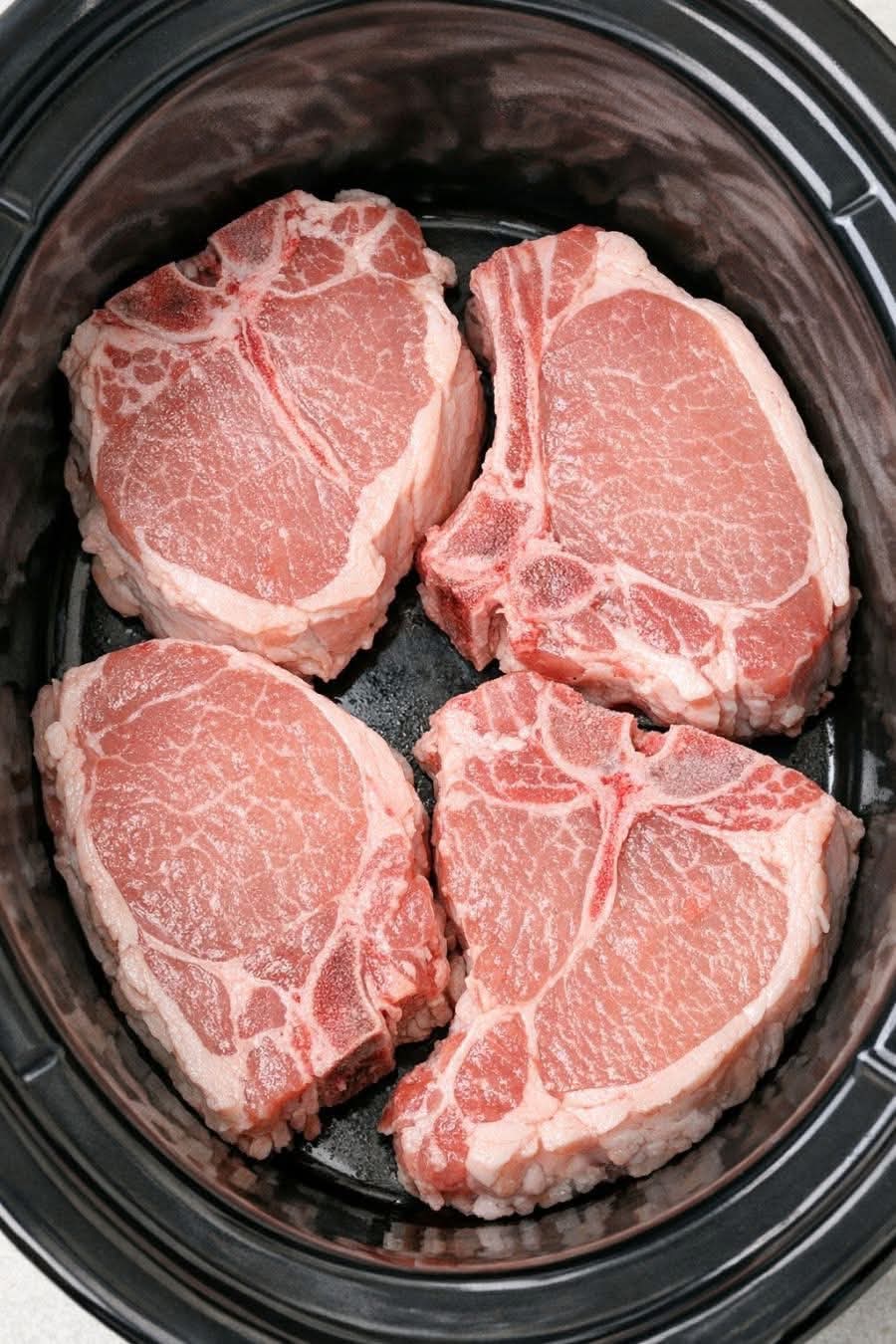 Place the pork chops in the slow cooker.
