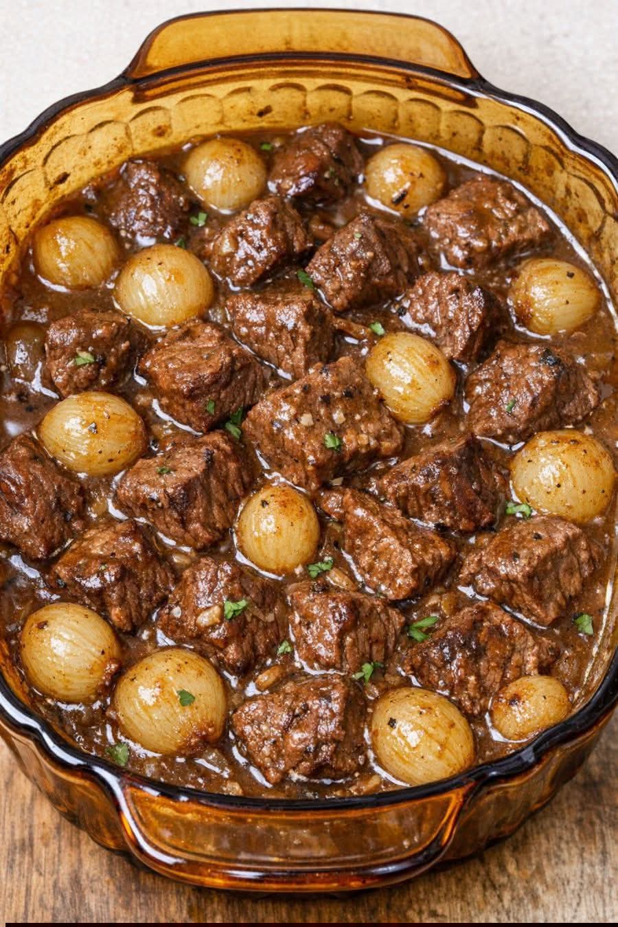 Place the beef chunks in a greased casserole dish or Dutch oven.